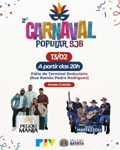 O 2º Carnaval Popular de São João Batista será realizado nesta sexta-feira (13/02), a partir das 20h, no pátio do Terminal Rodoviário Nelson Zunino. Com acesso gratuito, a programação inclui apresentações da Banda Maffezzoli e do grupo Pegou Mania, além de desfile de blocos.