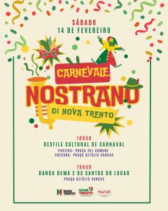 A Secretaria de Cultura e Turismo de Nova Trento convida a comunidade e os visitantes para participarem do Carnevale Nostrano di Nova Trento, que acontece neste sábado, dia 14 de fevereiro, na Praça Getúlio Vargas, no centro da cidade.