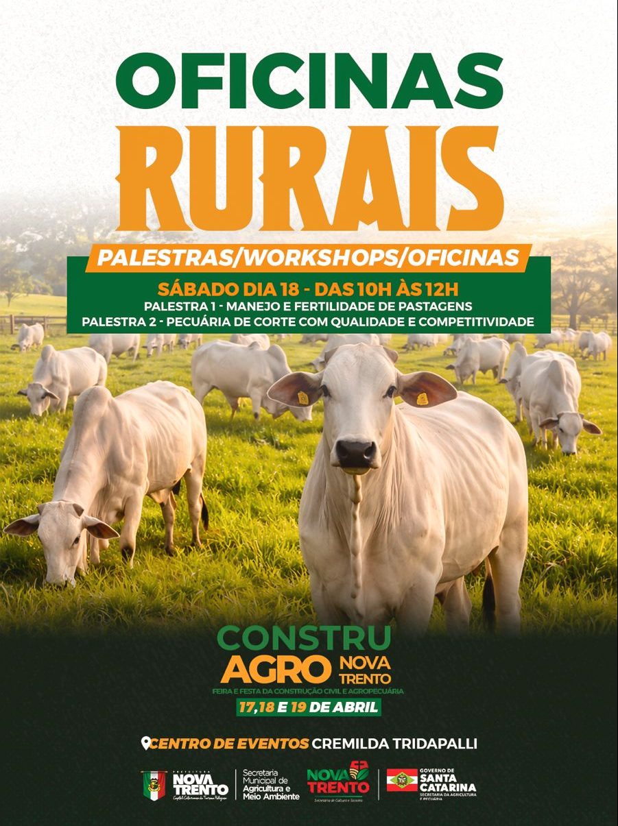 A programação da 1ª Construagro – Feira e Festa da Construção Civil e Agropecuária de Nova Trento segue com destaque para as oficinas técnicas voltadas ao fortalecimento da pecuária, que acontecem neste sábado, dia 18 de abril.
