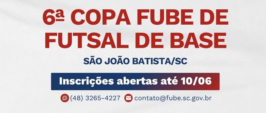 Vem aí a 6ª Copa Fube de Futsal de Base! As inscrições já estão abertas para a competição, que acontece em São João Batista. As equipes interessadas em participar da disputa devem se inscrever até o dia 10 de junho. As vagas são limitadas.