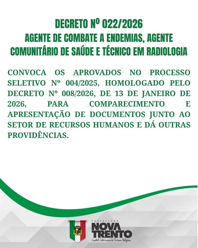 A Administração Municipal de Nova Trento informa que, por meio do Decreto nº 022/2026, foi realizada a convocação dos candidatos aprovados no Processo Seletivo nº 004/2025, homologado pelo Decreto nº 008/2026, de 13 de janeiro de 2026.