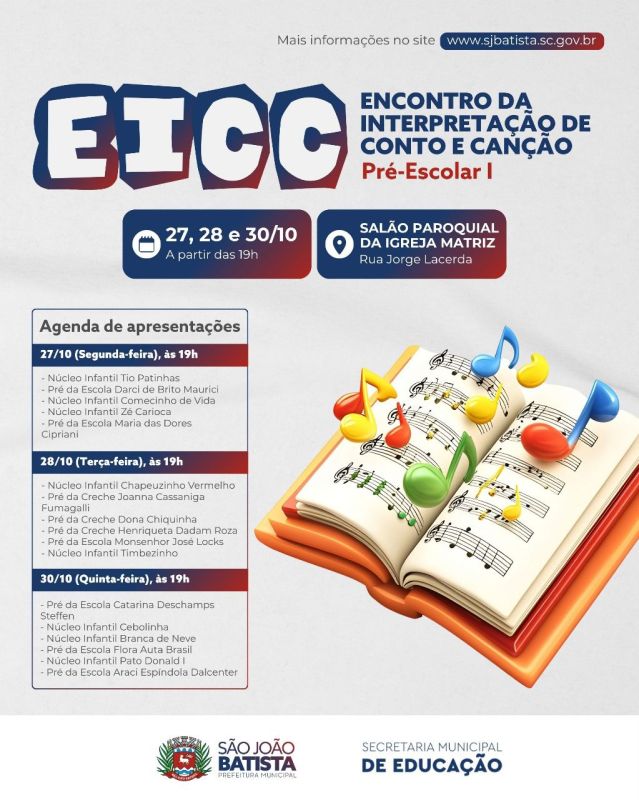 A edição de 2025 do Encontro da Interpretação de Conto e Canção (EICC) será realizada nos dias 27, 28 e 30 de outubro, às 19h, no Salão Paroquial da Igreja Matriz. O evento reunirá aproximadamente 400 crianças das turmas de Pré I da rede municipal, que apresentarão interpretações artísticas de histórias e músicas trabalhadas ao longo do ano letivo.