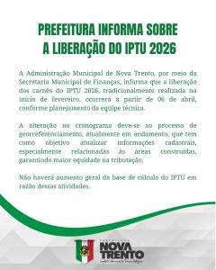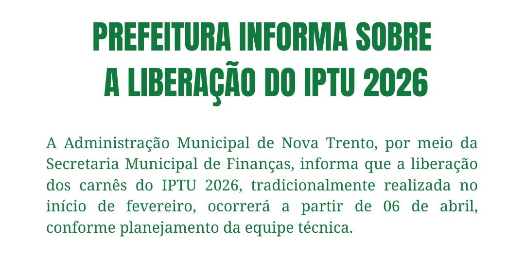 A Administração Municipal de Nova Trento, por meio da Secretaria Municipal de Finanças, informa que a liberação dos carnês do IPTU 2026, tradicionalmente realizada no início de fevereiro, ocorrerá a partir de 06 de abril, conforme planejamento da equipe técnica.