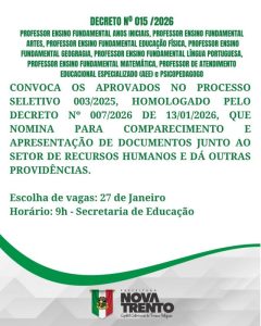 A Administração Municipal informa que por meio do Decreto nº 015/2026, foi realizada a convocação dos candidatos aprovados no Processo Seletivo nº 003/2025, homologado pelo Decreto nº 007/2026, de 13 de janeiro de 2026.