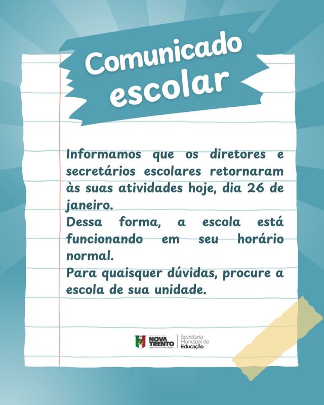 A Administração Municipal de Nova Trento, por meio da Secretaria de Educação, informa que os diretores e secretários escolares da Rede Municipal de Ensino retornaram às suas atividades nesta segunda-feira (26), atendendo nos horários normais de funcionamento das escolas.