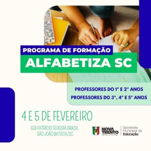 A Administração Municipal de Nova Trento, por meio da Secretaria de Educação, informa que o município participará, nos dias 4 e 5 de fevereiro, do Programa de Formação Alfabetiza SC, iniciativa voltada à capacitação de mais de 18 mil professores das redes estadual e municipais de Santa Catarina, com foco na alfabetização na idade certa.