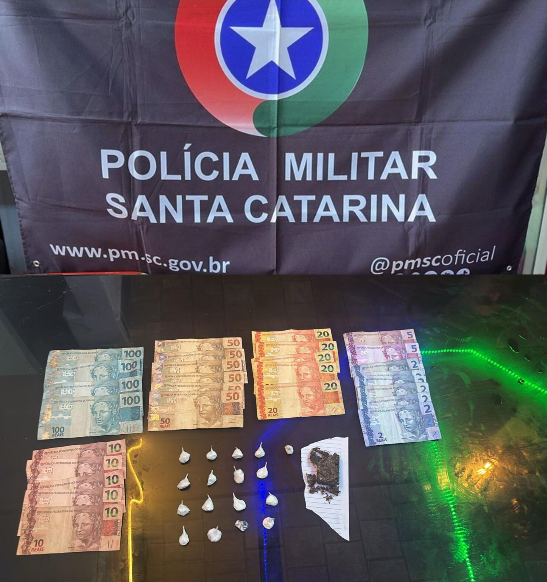 Durante a averiguação, foram localizadas diversas porções de substância análoga à cocaína, já fracionadas e prontas para comercialização, além de quantia em dinheiro em espécie, indicando indícios de tráfico de drogas. Assim, foi dado voz de prisão aos envolvidos e feita a condução a Central de Plantão Policial para lavratura do flagrante.