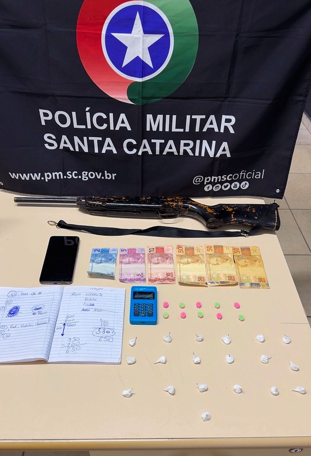 Na busca pessoal, foram localizadas porções de substância análoga à cocaína, já fracionadas e prontas para comercialização, além de dinheiro em espécie e um aparelho celular. O suspeito também portava uma espingarda de pressão.