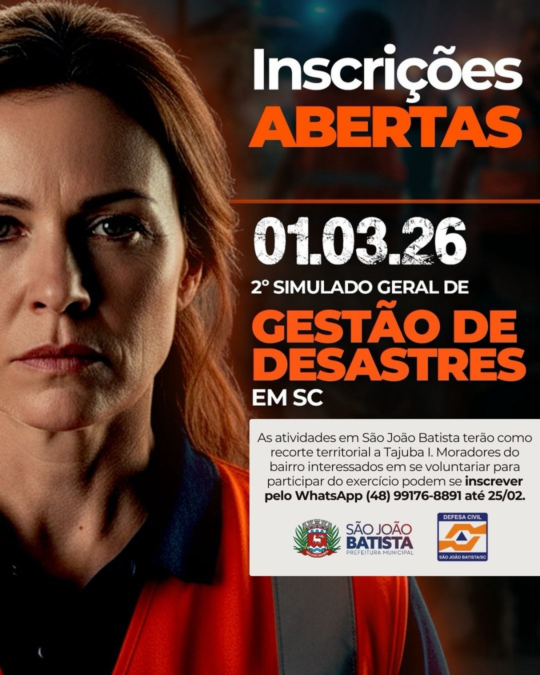 São João Batista estará entre os municípios participantes do 2º Simulado Geral de Gestão de Desastres de Santa Catarina, que será realizado no dia 1º de março de 2026 (domingo) em todo o estado. A iniciativa é promovida pela Secretaria de Estado da Proteção e Defesa Civil e tem como foco o fortalecimento da cultura de prevenção, proteção à vida e resposta a situações de risco.