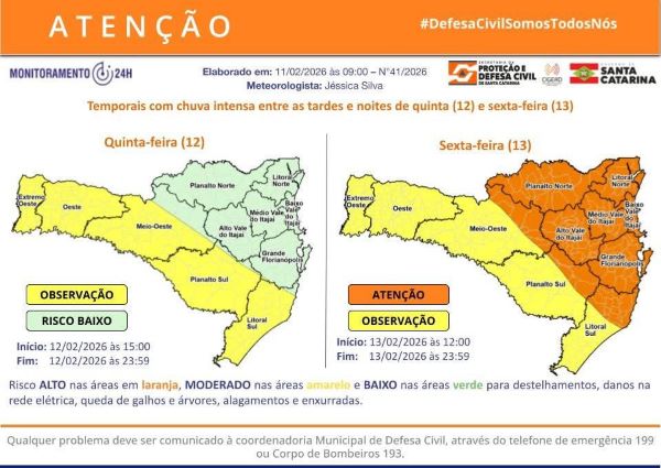Na quinta-feira (12), o calor combinado com a umidade disponível na atmosfera, favorece o desenvolvimento de temporais isolados entre a tarde e noite, em Santa Catarina. O risco é baixo a moderado para ocorrências asssociadas a destelhamentos, danos na rede elétrica, queda de galhos e árvores e alagamentos, especialmente nas áreas de divisa com o Rio Grande do Sul.