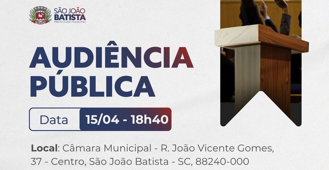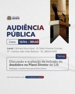 O Conselho Municipal do Plano Diretor de São João Batista realiza, nesta quarta-feira (15/04), uma audiência pública para discutir a possível inclusão do desdobro na legislação municipal. O encontro ocorre na Câmara Municipal de Vereadores, na Rua Vicente Gomes, nº 37, no Centro.