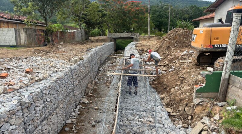 A Prefeitura de Canelinha segue em ritmo acelerado com a execução da obra de muro de contenção em gabião de pedra arrumada nas margens do ribeirão dos Papagaios. Os trabalhos estão sendo realizados na Rua Maria Lopes de Souza, no bairro Papagaios, nas proximidades do Campo do Palmeirinhas.