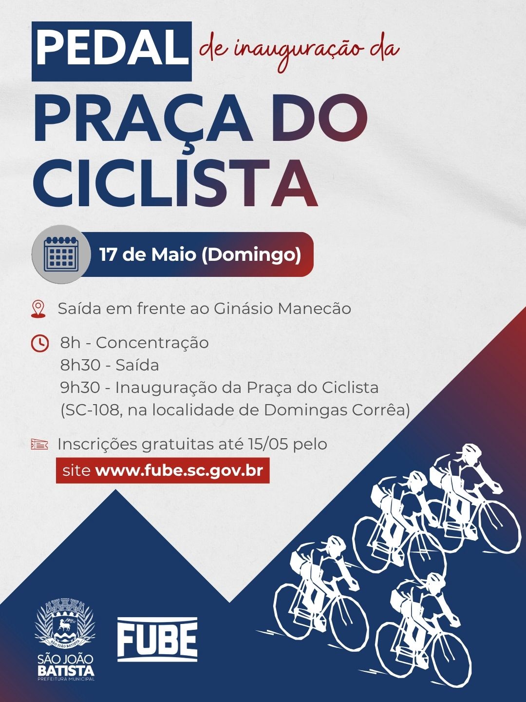 Um pedal aberto à comunidade, no dia 17 de maio (domingo), marcará a inauguração da Praça do Ciclista Adelir Gonçalves, no interior de São João Batista. A programação inicia às 8h, com concentração em frente ao Ginásio Manecão. A saída está prevista para 8h30, com destino à localidade de Domingas Corrêa, no bairro Colônia Nova Itália, onde ocorre a cerimônia oficial às 9h30. O retorno acontece logo após o ato.