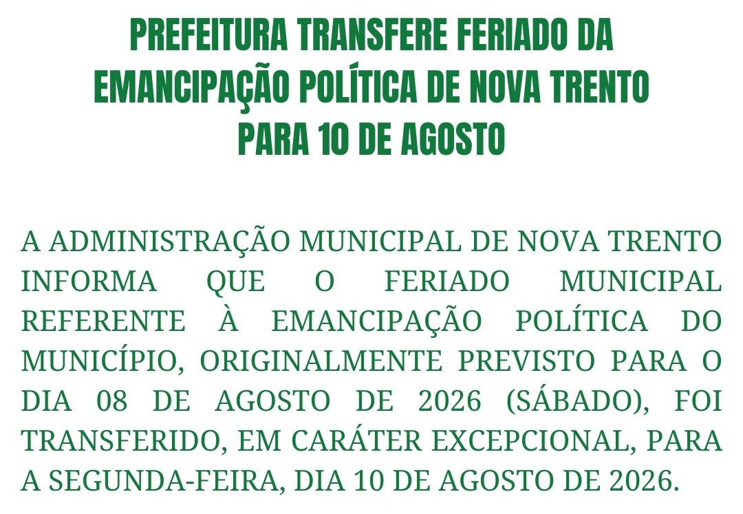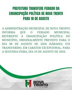 A Administração Municipal de Nova Trento informa que o feriado municipal referente à Emancipação Política do Município, originalmente previsto para o dia 08 de agosto de 2026 (sábado), foi transferido, em caráter excepcional, para a segunda-feira, dia 10 de agosto de 2026.