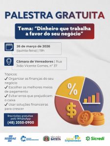 A Sala do Empreendedor de São João Batista realiza, no dia 26 de março, uma palestra gratuita voltada a empreendedores interessados em aprimorar a gestão financeira de seus negócios. O encontro terá como tema “Dinheiro que trabalha a favor do seu negócio” e acontece às 19h, na Câmara de Vereadores de São João Batista (Rua João Vicente Gomes, nº 37).