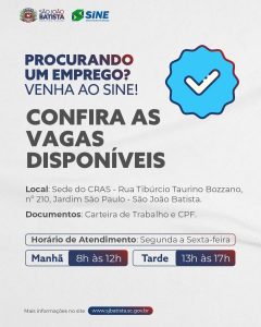 O Balcão do Trabalhador do Sine de São João Batista está com vagas de emprego abertas. Interessados devem comparecer ao posto do Sine da cidade, portando carteira de trabalho e CPF. Os candidatos que preencham o perfil requerido serão encaminhados para entrevista junto à empresa contratante.