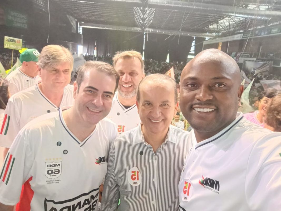 No encontro do MDB, Adão aparece ao lado do governador Jorginho Mello (PL), e do secretário de Estado da Agricultura, Carlos Chiodini (MDB), ao qual poderá concorrer ao cargo de vice-governador, na chapa com o PL.